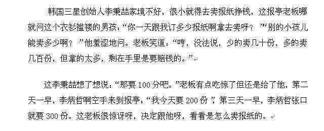 就是这个报童创建了今天的三星电子,心灵鸡汤说:同样的事有时换个思路或方法会有意想不到的收获。这句鸡汤你看了是不是觉得有道理呢?其实没什么鸟用。因为我们哪知道怎么换思路啊,具体到某件事我们依然麻爪。