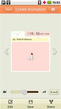 在拍照制作功能中,你可以使用手机摄像头即时拍摄图像,并制作成动态图片。不但能够像摄像机一样拍摄,还可以手动拍摄并拼接成动画。软件还支持将制作好的图片直接分享到微薄、校内上与朋友分享。