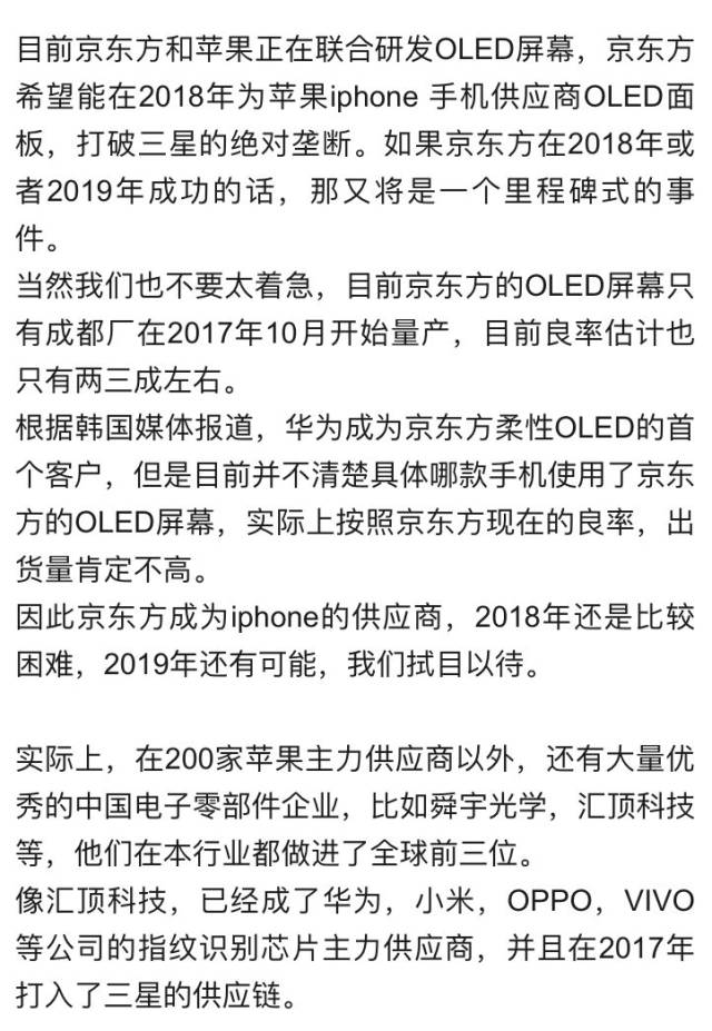 事实上,这23家主力公司以外,还有不少中国公司在试图打入苹果供应链,其中最大的一家就是京东方,该公司实际上已经进入了苹果供应链,液晶面板为苹果MAC供货,但是出货较少,毕竟手机业务才是大头,所以暂时未被列入主力供应商。