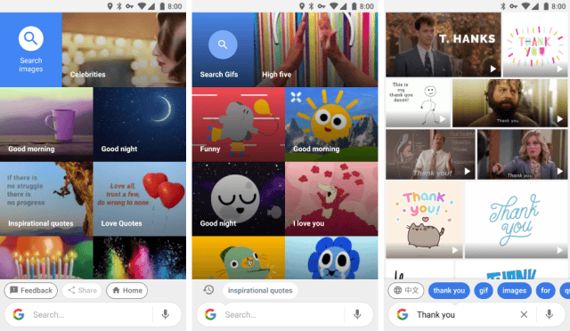 图片搜索和 GIF 搜索是很有意思的两个功能,因为它们会给出一些特定的分类,例如什么壁纸啊,励志图片啊之类的,而 GIF 搜索功能更是别无仅有,算是 Google Go 的特色了。