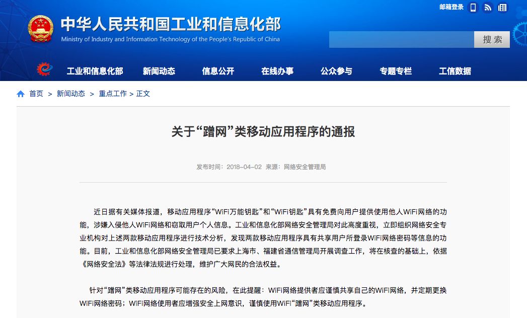 日前,工信部官网发布关于“蹭网”类移动应用程序的通报。