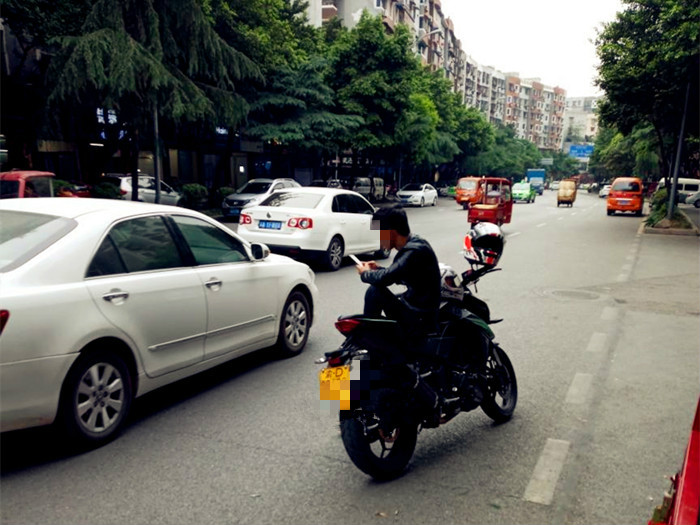 2018年5月10日上午,重庆璧山璧永路附近的道路上,有市民看到一小伙,朝着车来车往的车道,侧坐在摩托车上低头刷着手机,一旁是各色车辆经过的道路。