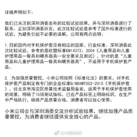 在深圳消协公布检测报告后,小米也迅速做出了回应,大意是:用儿童餐具的标准检测我的手机壳?这个锅我不背!而且我的壳子都是北京质监局备案过的。