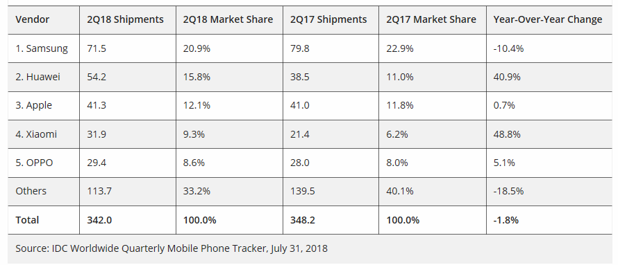 据市场调研公司IDC昨日发布的报告显示,今年第二季度全球智能手机出货总量达到3.42亿部,较去年同期的3.482亿部下滑1.8%。其中,华为当季智能手机出货总量达到5420万部,同比增长40.9%,超越苹果成为全球第二大智能手机制造商。小米当季智能手机出货总量达到3190万部,同比增长48.8%,销量排名仅次于苹果。