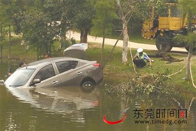 10月15日11时许,松山湖大学路附近,一辆小轿车偏离道路开进湖里。松山湖交警大队接到报警后,立即派民警赶赴现场。当时,轿车车头已经完全下沉,车内无人。随后,民警联系一辆交通拯救车,将轿车拖吊上来。