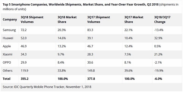 IDC数据显示,全球厂商在本季度智能手机出货量为3.552亿部,比2017年第三季度的3.778亿部下降了6%。这是全球智能手机市场连续四个季度出现同比下滑,IDC认为到2019年手机市场将恢复增长。