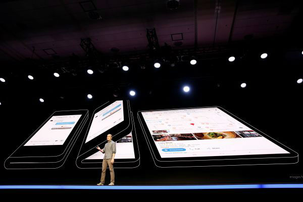 11月7日,在美国加利福尼亚州旧金山举行的三星开发者大会上,谷歌安卓UX部门负责人格伦·墨菲发表讲话,介绍三星新推出的“Infinity Flex”可折叠显示屏。(路透社)