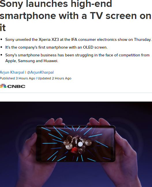 Xperia XZ3是这家日本巨头的第一款配备有机发光二极管或OLED显示器的设备,与和三星等中高档手机厂商的日益激烈的竞争。根据 Counterpoint Research 的数据,索尼在2018年第二季度仅占全球智能手机市场份额的0.6% ,低于去年同期的1% 。