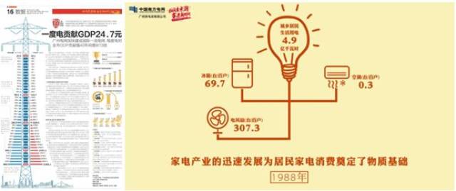 值得一提的是,这一数据新闻策划在纸媒端和新媒体都有所呈现,并且在新媒体端口,除了纸媒端的可视化图表和文字,还配合推出了可以单独成为产品的系列短视频《40年40秒》。以40秒的动画,更生动地反映主题。同时,视频中选取数据的切口更小,数据量更大,同样是电力这一期,视频中还加入了1988-2018年广东百户居民拥有空调数量的变化等数据,从家电数量的增长侧面反映普通家庭经济水平的提升。