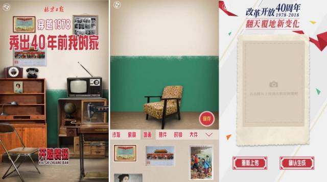 除了静态单向的图片对比,在新媒体的助力下,呈现改革开放40年巨变还有了更加生动的呈现形式。如北京日报客户端推出H5互动类小游戏《40年前我的家》,让用户可以用40年前的老物件——黑白电视机、永久自行车、卡带式收录机等装扮自己的家,用户自然带入40年前的家庭环境中,以小家的变化,折射出发展带给民众切实的变化。