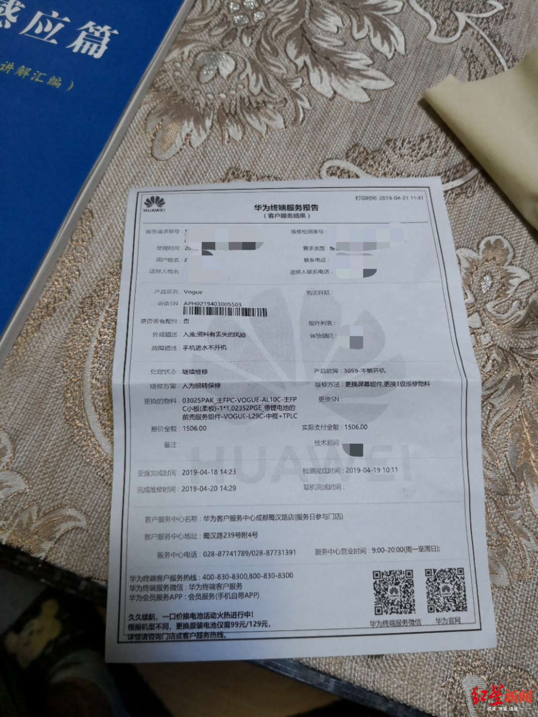 当天,巫先生便带着手机来到位于四川成都金牛区的华为客服中心蜀汉路店,要给自己讨个说法。“维修时说手机屏幕烧坏了,换了后还是没修好,又说主板烧坏了,要更换主板。”巫先生告诉红星新闻记者,自己已经花费了1506元购置屏幕,如今不知又要花多少钱重换主板。