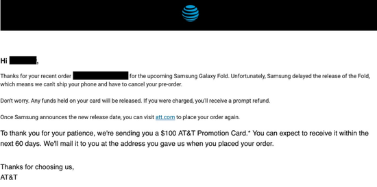 据悉,AT&T表示,预付的所有款项都将如数退还,受影响的客户还将在未来60天内收到100美元的AT&T促销卡作为补偿。一旦三星宣布新的发布日期,客户可以通过AT&T重新订购Galaxy Fold,但目前还不清楚到底是什么时候。