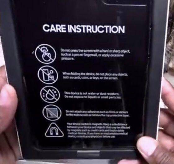 三星官网视频中有详细的“保养说明”指南,提醒消费者要“精心呵护”,建议消费者将折叠机远离尖锐物品,不要施加“过大的压力”并且不要将折叠屏暴露在液体或小颗粒中。