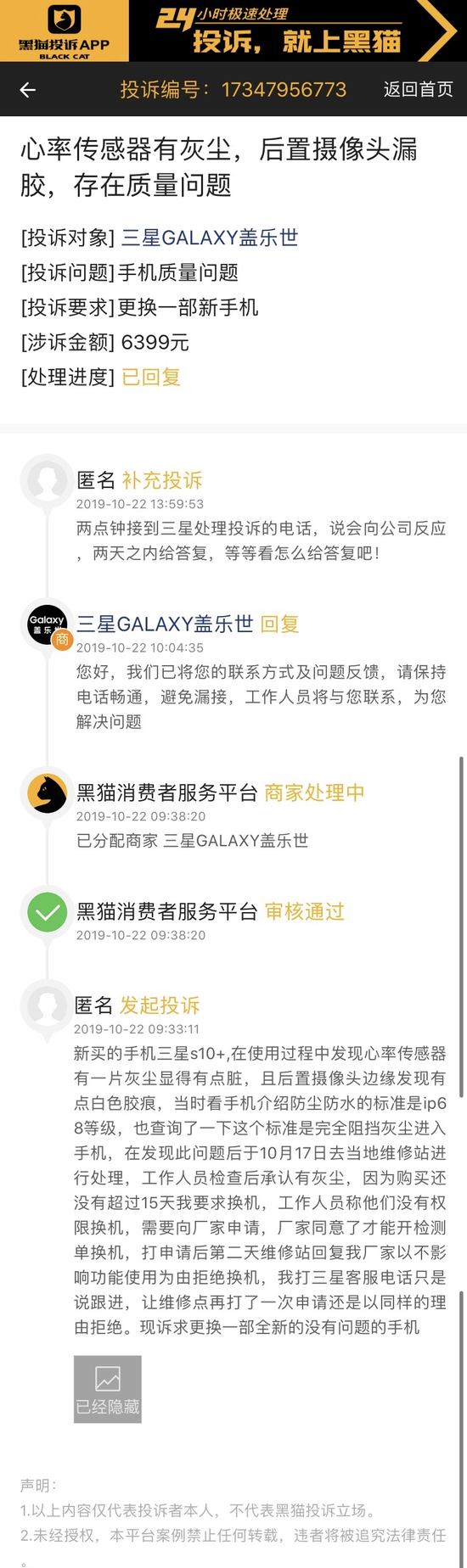10月22日,网友在黑猫投诉河南站反映:新购买未超过15天的三星s10+在使用过程中发现心率传感器有一片灰尘显得有点脏,且后置摄像头边缘发现有点白色胶痕,当地维修站检查后承认有灰尘,网友要求换机厂家以不影响功能使用为由拒绝换机。@三星GALAXY盖乐世 在平台作出回复后,网友补充投诉。