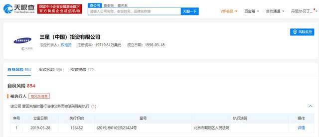 值得一提的是,天眼查数据显示,三星(中国)投资有限公司自身风险达854条。今年5月,该公司被北京市朝阳区人民法院列为被执行人,执行标的136452。