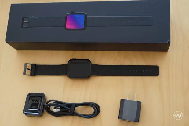 △ 小米手表开箱包装清单:印有小米浮雕图案的外包装盒、手表、触点式充电底座、充电头、说明书。