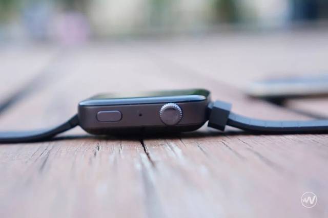 右侧是与 Apple Watch 同款表冠、开/关机按键,左右各一颗麦克风,左侧长条缝隙是扬声器。