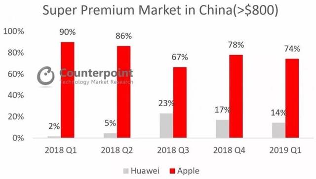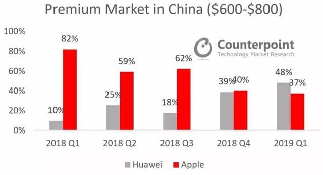 日前,国际知名市场调研机构Counterpoint Research发布的报告显示,2019年第一季度,中国售价600—800美元(约合4100元—5500元)的高端细分手机市场中,华为首次超越苹果,市场份额高达48%,远超苹果的37%,且差距正在不断拉大。