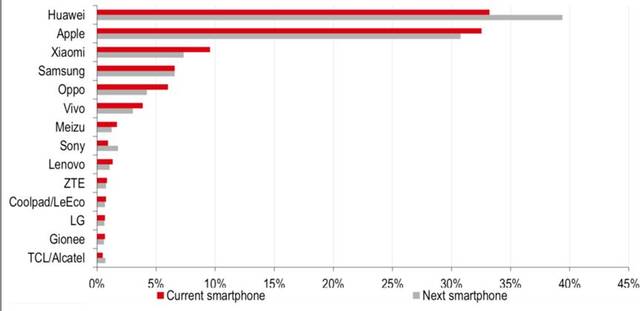 另据汇丰一份针对中国消费者偏好的内部调查称:有明显证据表明消费者偏好正在发生变化,对苹果的偏好显然正在转移到华为身上。例如在中国消费者中,目前33%使用华为手机,32%使用iPhone。对于下一部手机倾向买什么,39%表示会购买华为,31%表示会购买iPhone。而去年,表示下一步会购买华为和iPhone的比例分别为25%和40%。