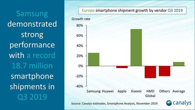 华为失去的市场份额正在被三星和中国友商填补。第三季度,三星欧洲市场出货量为1870万部,同比增长26%,稳居欧洲市场销量冠军。然而,相比上季度,三星的市场份额下滑了4.6%。