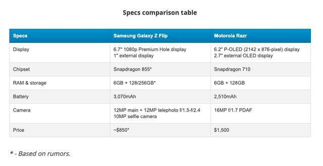 相机部分摩托罗拉Razr摄像头像素只有1600万像素,同时可用作自拍;而三星Galaxy Z Flip有望配备双摄像头,包括1200万主摄像头和1200万长焦摄像头,采用f / 1.5-f / 2.4可变光圈、OIS防抖、2倍光学变焦以及以60fps录制4K视频和以960fps录制1080p 慢动作视频,与Galaxy S9 +上的相机设置非常相似,搭载1000万像素前置摄像头,该摄像头位于打孔位置。