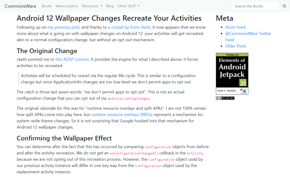 所以出现这个事情的原因可能是 Android 12 为了确保应用程序也可以跟进这个新的特性。与之前版本的 Android 系统在深色主题和浅色主题之间切换时应用程序有时也会重启的原因类似。