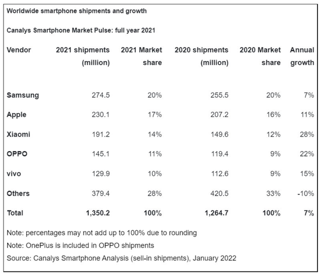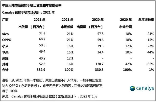 首先是2021的国内手机市场,调研机构Canalys的数据显示,vivo出货量7150万台,市场份额21%,增长24%位居第1;OPPO出货6870万台,同样以市场份额21%位居第2,增长15%;小米出货5050万台,市场份额15%位居第3,增长27%;苹果出货4940万台,市场份额15%,增长44%位居第4;荣耀出货4020万台,市场份额12%位居第5。