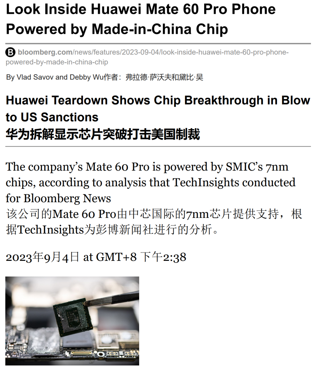 “现在中国已经证明其至少可以生产一定数量的、仅落后最先进技术5年的芯片了”,彭博社写道,“这距离中国在半导体这个关键领域实现自给自足,又进了一步”为彭博社进行拆机的TechInsight公司的一名高管亦表示,这款芯片是来自中国的一个“相当重要的声明”。