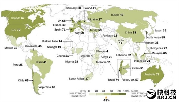 美国科技媒体Mashable送出了一份各国智能手机的普及率,排在第一位的是韩国,其智能手机普及率达到了88%,作为对比,美国的普及率也只不过72%。