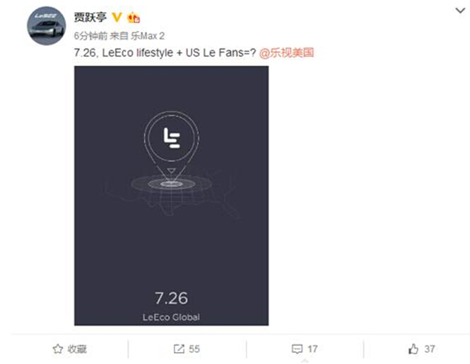 7月21日,乐视CEO贾跃亭通过个人官方微博发布了一张画面简洁的海报,并点评说“7.26,LeEcolifestyle+USLeFans=?“,结尾处还@乐视美国。这张悬疑味道十足的海报中,内容元素非常简单:正中央是乐视LOGO,其下是抽象的美国地图,在最底部则展示了7月26日,以及LeEcoGlobal两个关键信息,引人浮想联翩。