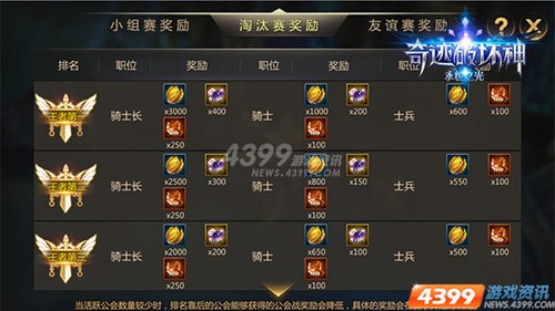 淘汰赛在每周日的20:50-22:10举行,到了最后这一环节,所有人都会使出浑身解数全力作战。每个公会可以任命一名【骑士长】,十名【骑士】,剩余为【士兵】。按照军衔不同,匹配作战的对手也不同。不管军衔如何,只有公会上下一心,争取拿下每一战,才能保证成为王者之师!在紧张刺激的淘汰赛的同时,没有进入小组赛的公会也在进行着友谊赛,友谊赛也会有稀有的奖励发放!