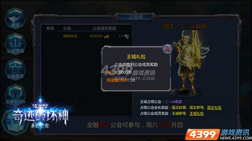 4399《暗黑奇迹》巅峰内测还将上线全新公会战,每周六21:00-21:30震撼开启,全服前十公会均可参战!成功占领王城的公会,成员可开启王城礼包,千万金币和超级萌宠【捣蛋幽灵】等你来拿。各大暗黑军团已蠢蠢欲动,王城热血攻防战一触即发!