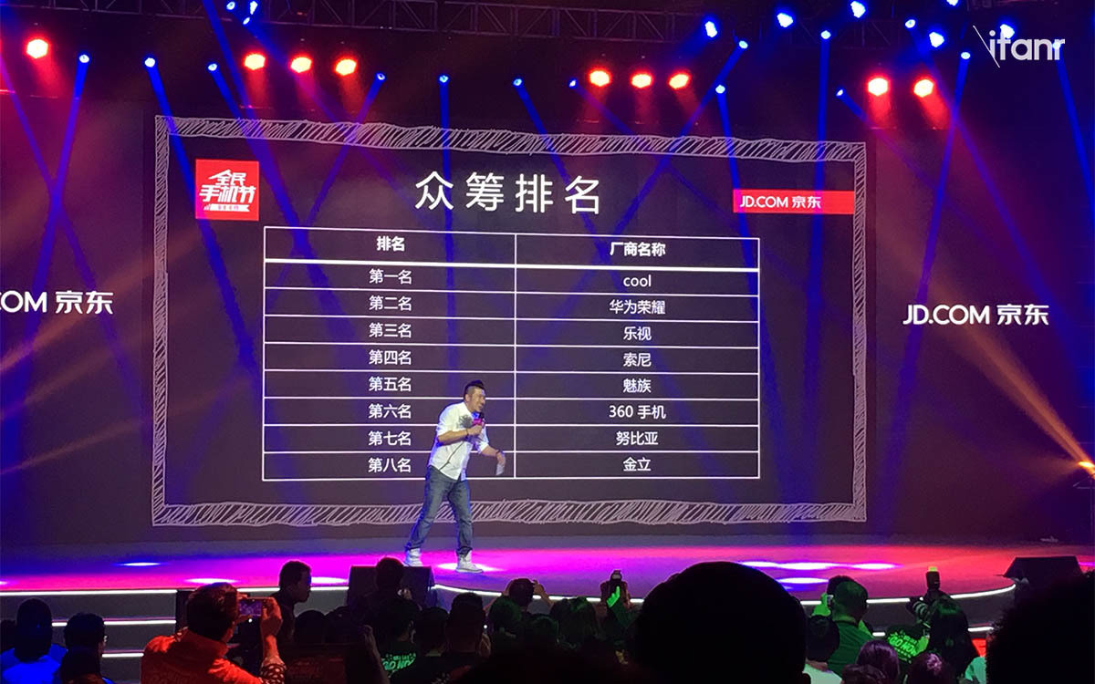 有些让我诧异的是,众筹第一名竟是刚刚在乐视生态体育中心发布不久的 Cool 手机,这家公司的新品 Cool1 刚刚发布就作为活动开始当天京东首发;而第二三名是华为荣耀和乐视;接下来是索尼、魅族、360 手机、努比亚以及金立等手机品牌。