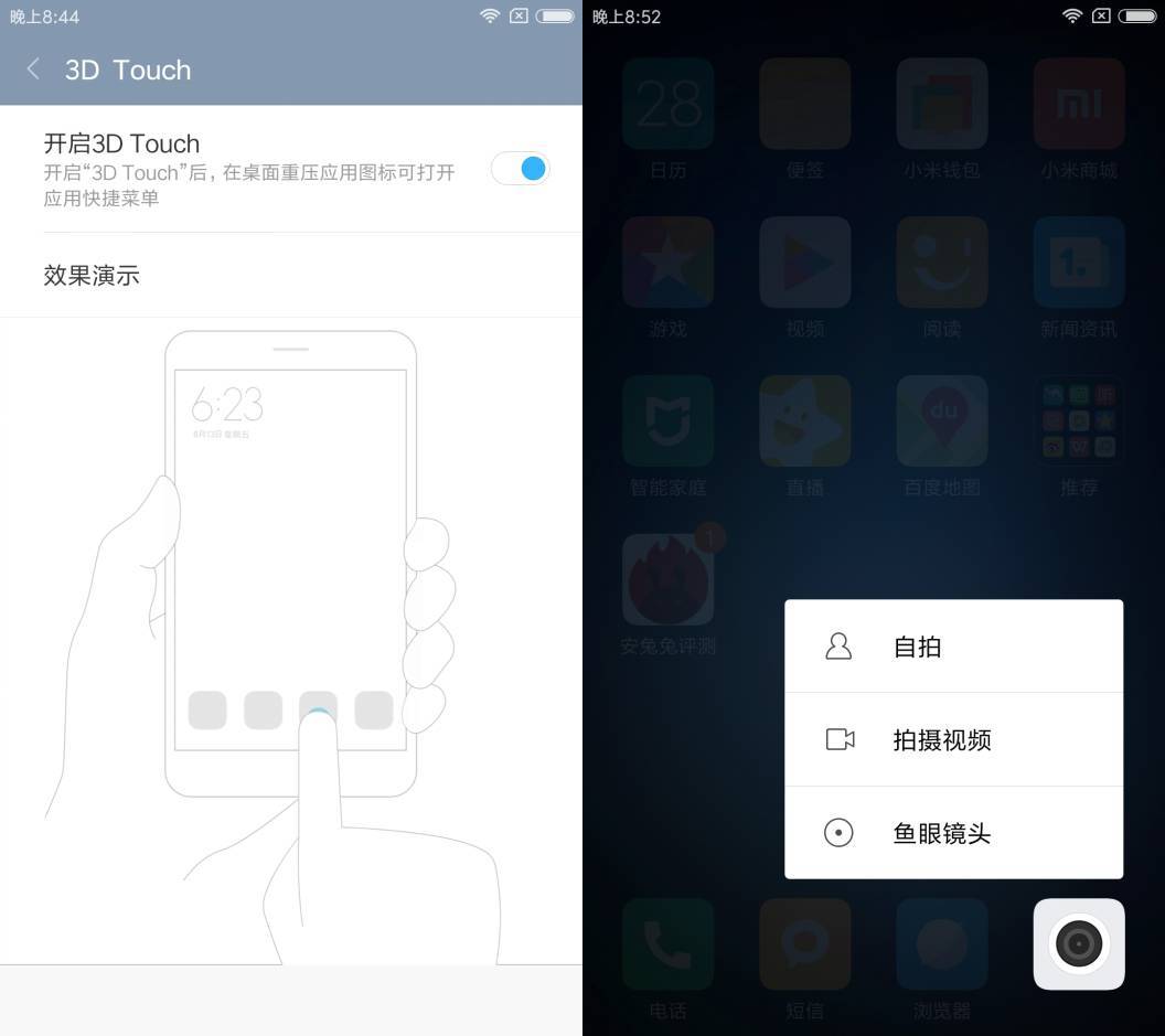 值得注意的是,4+128GB版小米5s支持压感屏,能实现iPhone 6s/7系列那样的3D Touch操作。不过我们也发现一些问题。首先,目前5s支持的程序还很少,基本只有几个内置应用,第三方APP几乎都没用。其次,它的压感屏无法调节按压力度,并且就我们的体验来看,需要用比较大的力才能激活,如果是女生单手操作可能有难度。再次,目前支持压感屏的手机基本都是激活压感菜单后,就可以接着滑动选择子菜单。但5s需要进行二次点击才可以,希望小米在后续固件更新中予以改进。