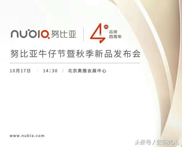 nubia智能手机官微称,“四年星辰之旅,只为超越极致,追寻无尽可能,10月17日北京奥雅中心,#努比亚牛仔节暨秋季新品发布会#,一起见证我们的再一次突破,用满满的诚意和惊喜,续写秋日传奇!”